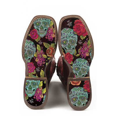 Tin Haul Ladies Square Toe Boots - Mon Cherry with Skull & Roses Sole