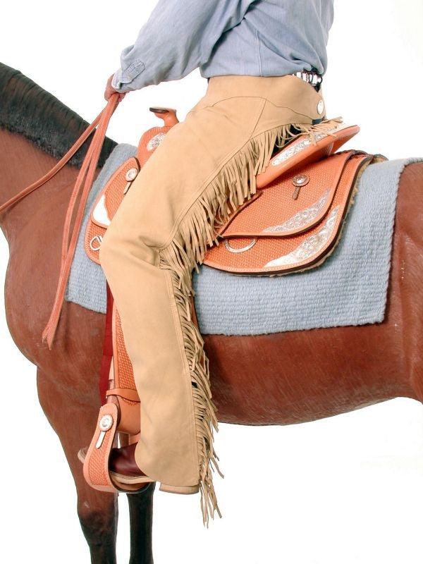Western Clothes like cowboy chaps are a trademark of both western style and function used to add individuality to an outfit or provide protection from the weather. Used on ranches by working cowboys and in both the show or rodeo arena by competitors, chaps range from plain to highly decorated. Cowboy Western chaps for women, men, and kids are made of leather, suede, or synthetic material with accessories such as decals or fringe added for flair.