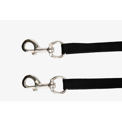 Horse cross ties safely secure the horse in a barn aisle or wash stall. Cross ties available in several materials such as nylon, bungee or rubber coated coil. Equine cross ties come with a variety of closure options including horse tie up rings and quick release hooks. These products allow the person tending to the horse to free it easily in an emergency. Cross ties are beneficial to equestrians for any task that requires a horse to remain securely in place such as bathing, shoeing or tacking up. Cross ties in 5 foot or 6 foot length. Cross ties come in adjustable or bungee style. Cross ties come in basic black or a variety of colors including green, blue or red.