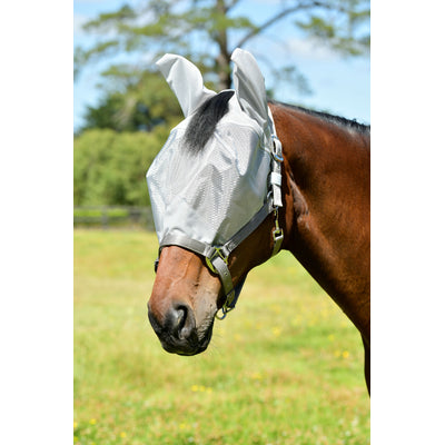 Fly control for horses comes in many forms. Horse fly masks, or horse fly bonnets, are used to protect an equine's eyes, ears and face from irritants such as flies or dust while being stalled or during turnout. Fly masks can also provide valuable UV sun protection to horses with sensitive eyes or skin. Horse fly masks are available in styles with ears or without and come available standard length or long length to cover the sensitive area of the nose. Horse fly masks are usually made of a mesh or lycra material. Veils are also used for equine fly protection as they keep a horse's ears and eyes safe from flies while riding or showing. Fly veils are usually a cotton crochet material and have ears. veils come in a variety of styles and .