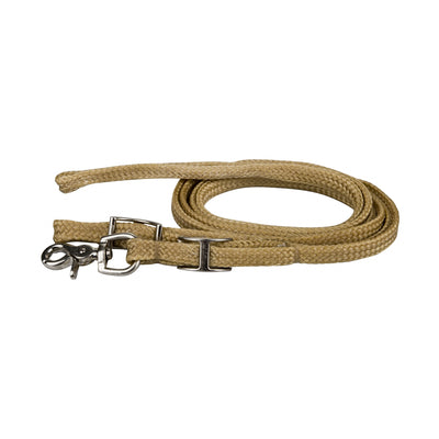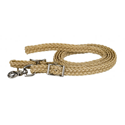 A Western rope is sometimes referred to as a lariat or a 'lasso.' A lariat is a loop of rope that is designed to restrain a target. Once the lariat is thrown around a target, the rope is pulled, which causes it to tighten. Lariat ropes are stiff, which ensures that the loop remains open even when thrown. Typically, rope reins are used to keep the lariat from getting tangled in the reins.