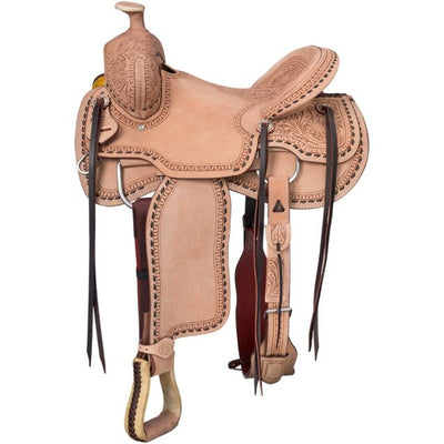 Western Saddles  come in a variety of styles. Western roping saddles are made for events like team roping, calf roping, team penning or ranch sorting. A roping saddle is a good choice as a ranch working saddle or for a tall or stout rider. The bullhide covered wood or fiberglass tree, large horn make the roping saddle good to handle the heavy wear from roping and ranch work. Youth roping saddles in youth size seats are available.