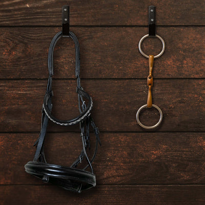 Tack racks and hooks are made to store or temporarily hang tack for your horse or pony for easy access. Tack racks and hooks are used in the barn or the horse trailer to keep bridles, martingales or other hanging items organized. Bridle horse hooks are typically curved like the equine's head to keep the bridle leather from cracking due to the pressure of a too narrow hook. Tack racks are designed to hold several items of tack at once. They are especially useful for cleaning tack. They come in portable or over the door versions in addition to the standard hooks.