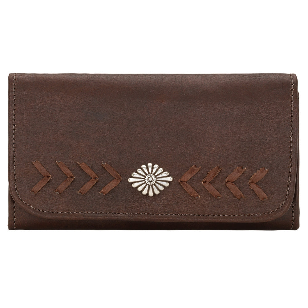 The American West Ladies Mohave Canyon Tri-Fold Wallet includes a snap closure and is the essence of simple sophistication. This elegant and uncomplicated collection is accented with lacing details. An exclusive pawn-style inspired silver concho completes the look. The full leather inside contains a flap for a checkbook, 13 card slots, and 5 compartments. The back has a zipper coin pocket. Each piece is made by hand, one at a time. Dimensions: 7.5" x 4".