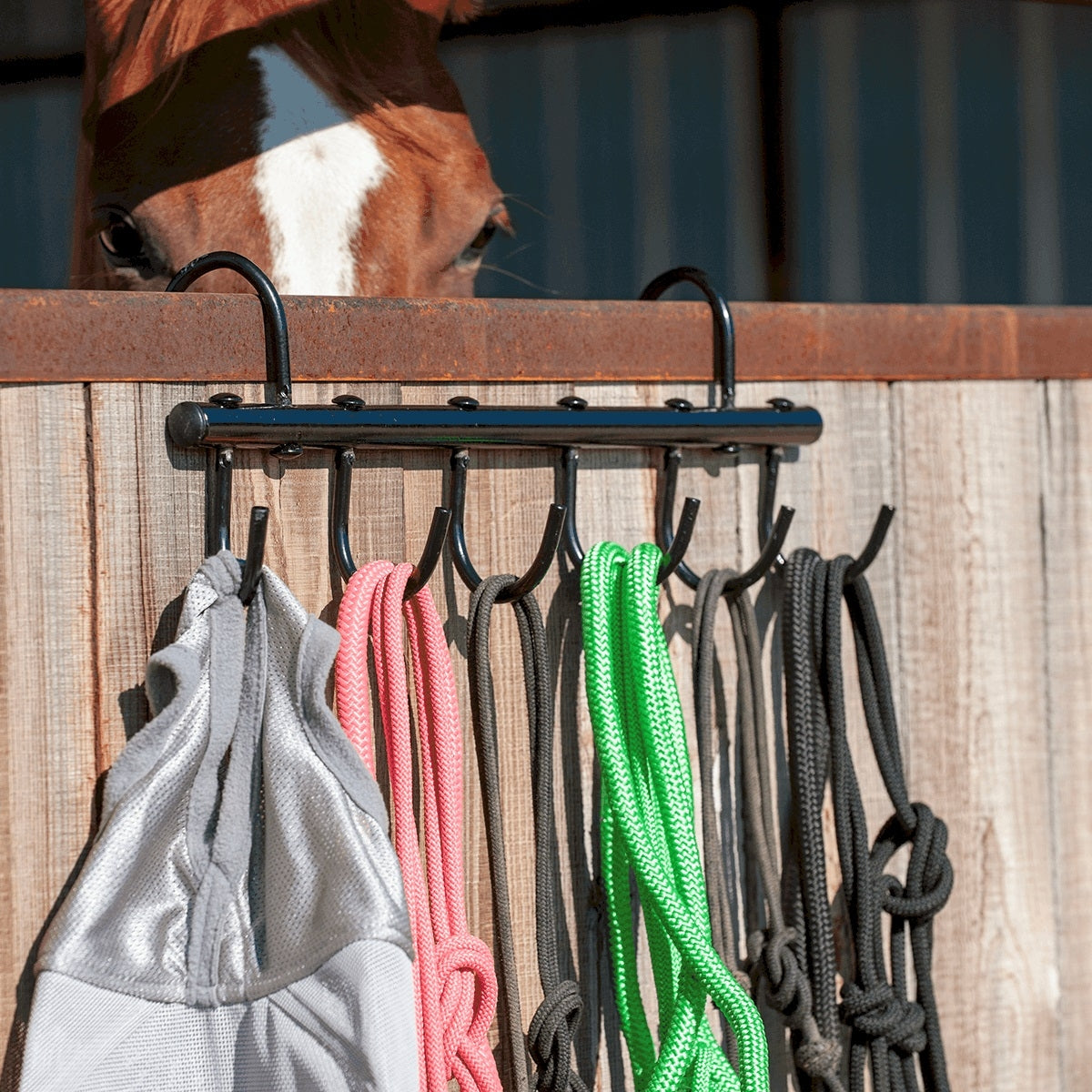 Metal bridle and halter hanging rack made to fit most standard pipe fences and stall fronts. 6-Hook Size: 21-1/2