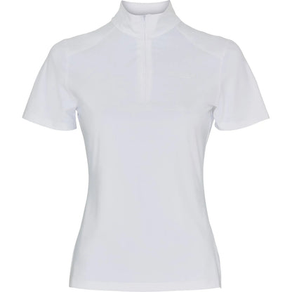 The Thelma is a classic equestrian design with a quarter zip and tab collar. It has short sleeves for the summer months, and is made in a lightweight, stretchy nylon and elastane blend fabric that is UV 30+ protective. The back of the shirt features a perforated panel that increases airflow and helps maintain a cooler body temperature.