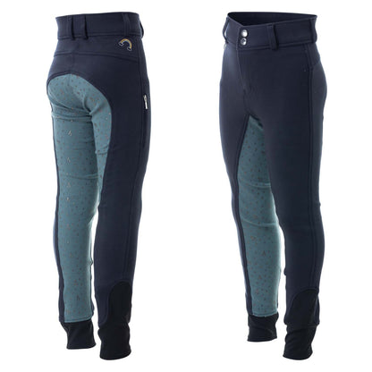 The perfect breeches for young girls who like to dress colorfully. The silicone full grip in pastel rainbow colors has the shape of raindrops and small 'h' logos. Below the back waistband a delicate rainbow embroidery is placed. Elastic leg cuffs for increased wearing comfort and less bulk beneath the boots. The breeches can be worn with a belt of your choice thanks to the belt loops. A zip pocket on the right thigh has enough room for your phone.
