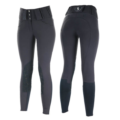 The Horze Women's Desiree Knee Patch Breeches are ultra high-performance breeches designed with a criss-cross silicone print knee patch for saddle security and a fashionable flair. The supportive waistband holds you in place and actually makes you sit taller in the saddle without slouching. The Eros fabric repels water and dirt so you look fresh and clean all day long. Nice color options make these breeches ideal for show or schooling. You will become accustomed to the beautiful feel of these well-made breeches. The flattering Desiree breeches include a high waist design featuring an attractive logo on the back with wide belt loops and a front zipper. In addition, the functional, breathable, bi-stretch fabric includes UV protection (UPF 50+).