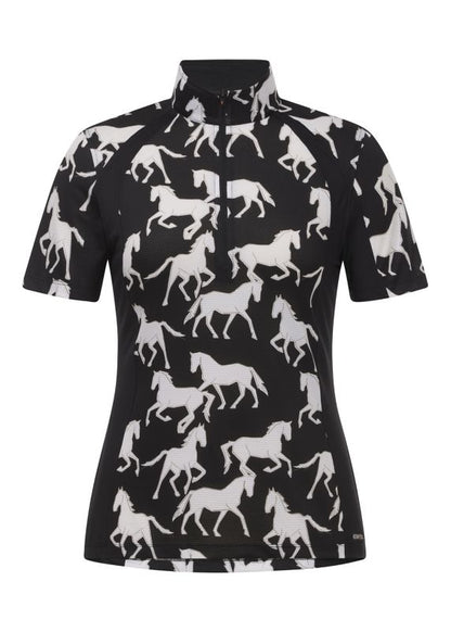 This ultra-light, short sleeve riding top cools and breathes stunning equestrian prints for a look that catches the eye and the summer breeze. Ice Fil fabric performs optimally in high heat, wicking and flowing as you trot on with UPF+30 sun protection. Solid panels shape a flattering silhouette. Pretty princess seams and equestrian hem create a feminine summertime favorite. Tall collar unzips to ventilate.
