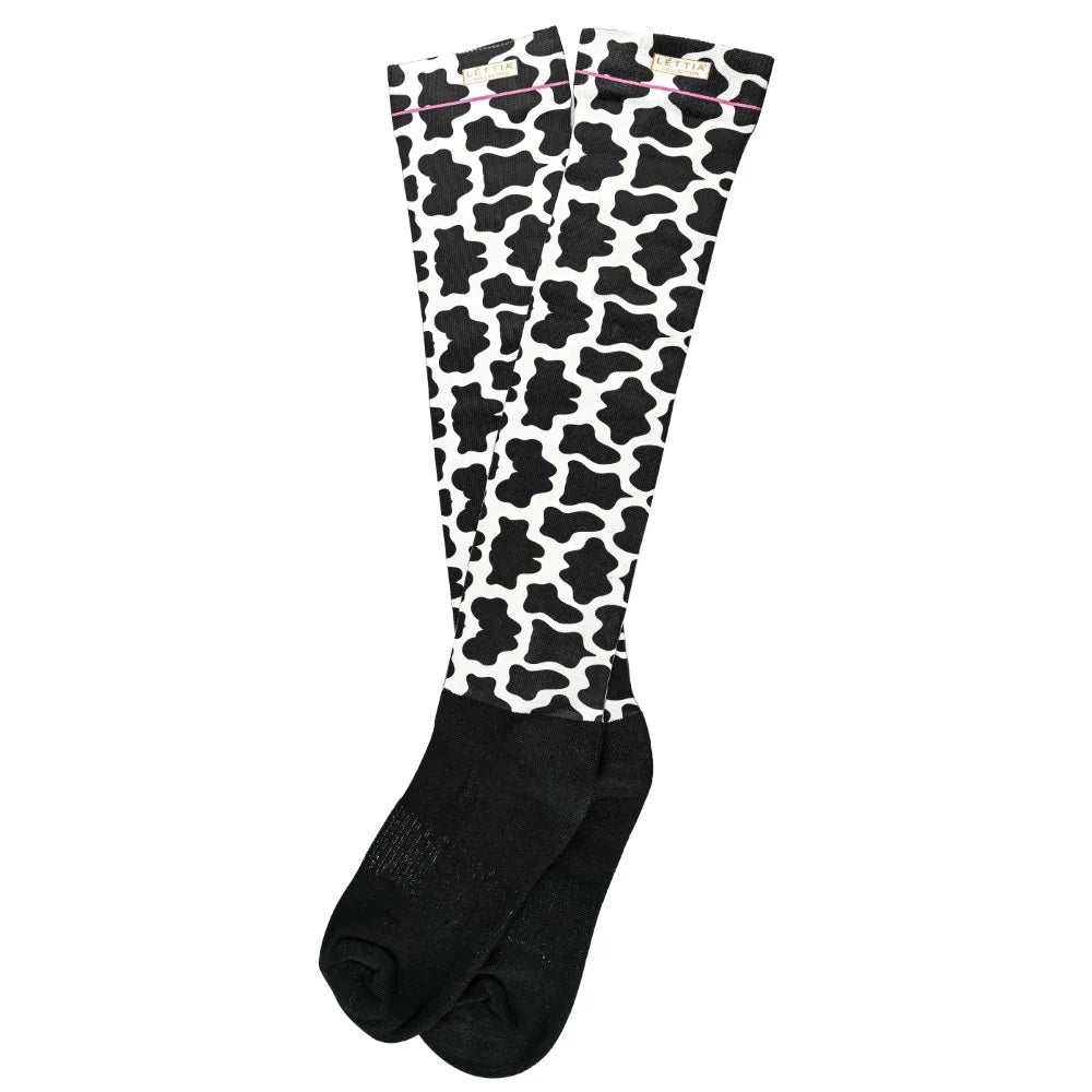 Lettia Cow Print Padded Boot Socks are stylish and comfortable socks designed for equestrian enthusiasts or anyone who enjoys outdoor activities. These socks feature a unique black and white cow print design that is both fun and functional. The socks are made from a blend of materials that include cotton, nylon, and spandex, which provide a soft and stretchy feel, ensuring a snug fit that won't slip down. These boot socks have a tall length that extends over the calf and up to the knee, providing ample coverage and protection against rubbing and chafing from boots or other footwear.