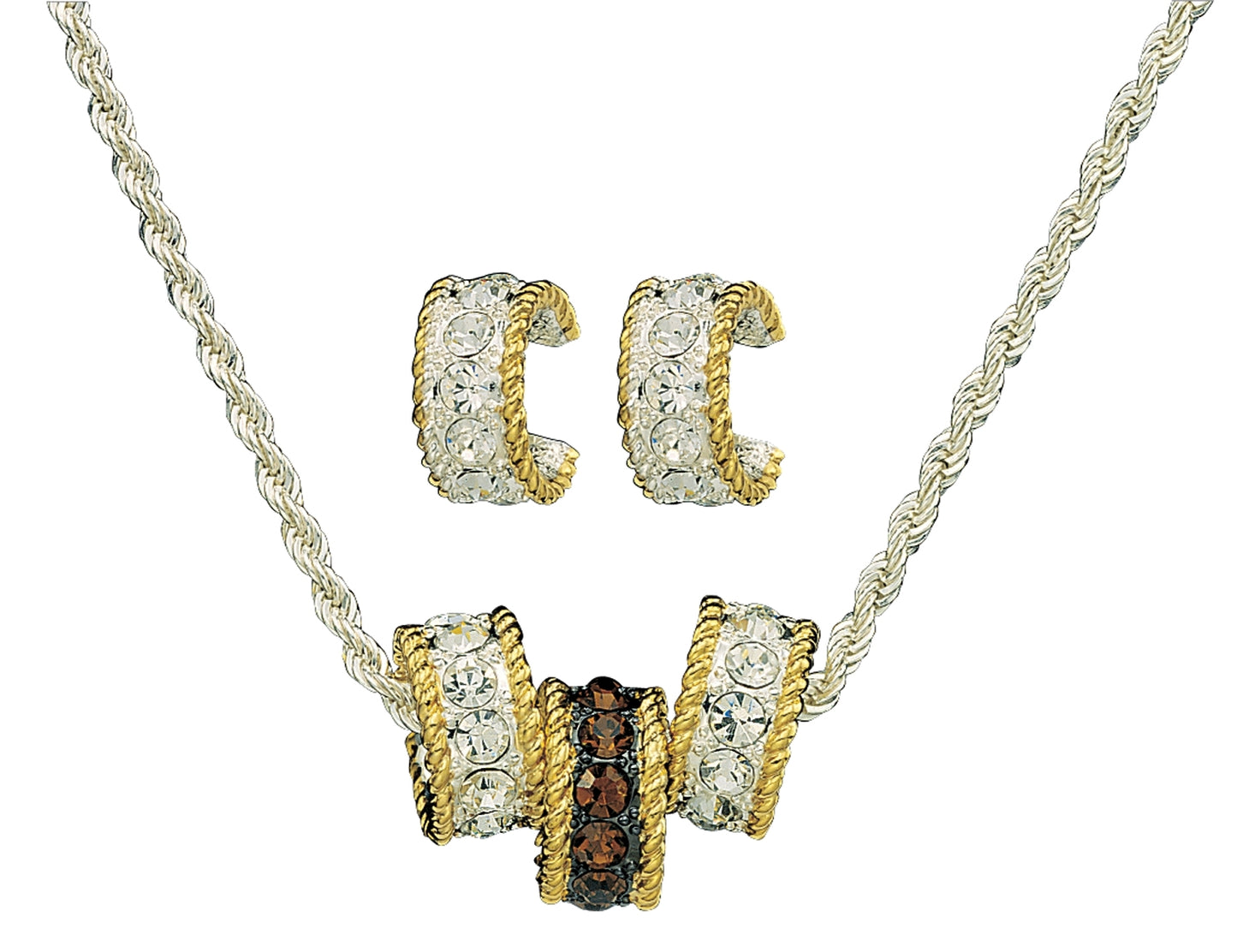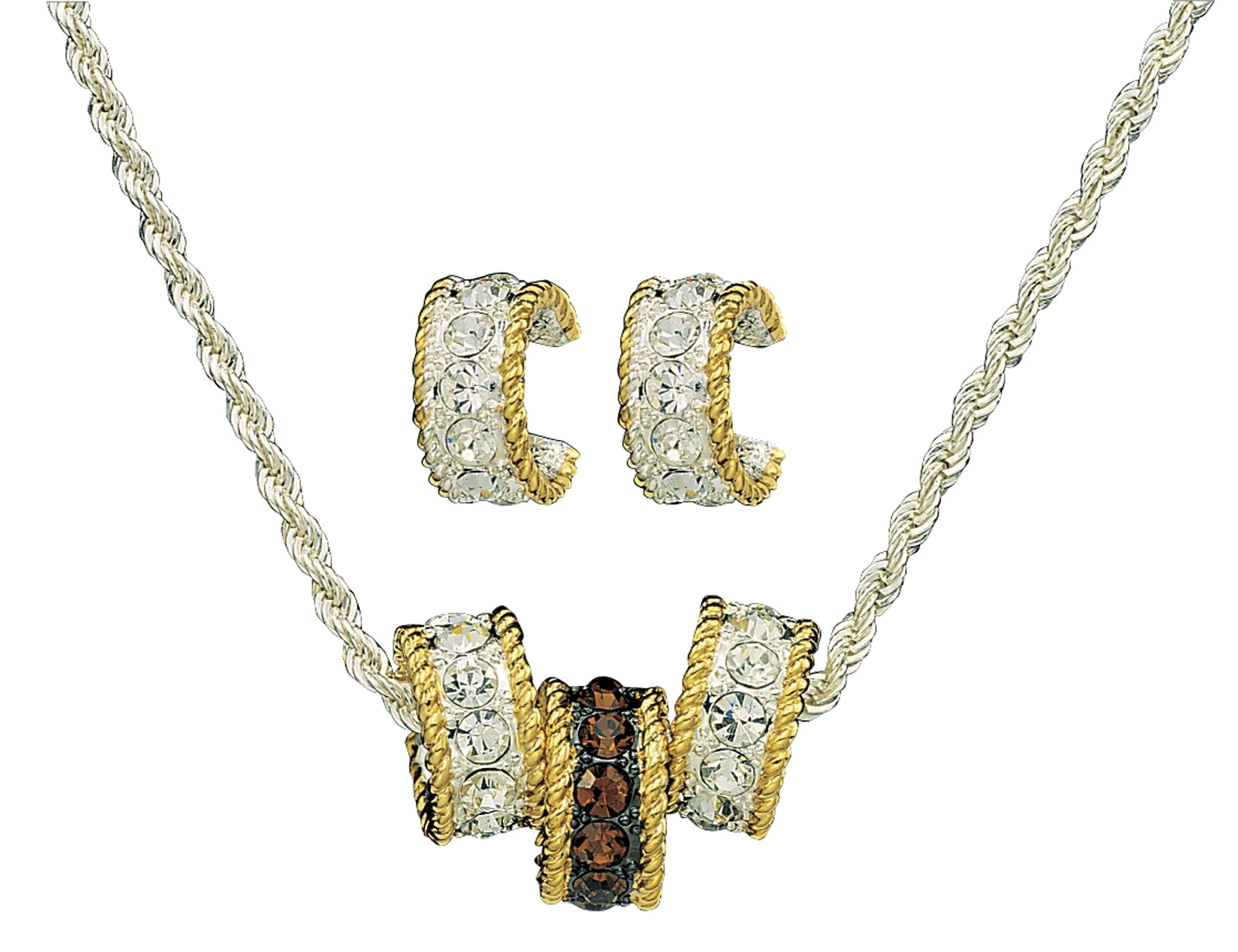One of Montana Silversmiths most popular designs, Topaz Crystal Shine features one topaz colored crystal ring flanked by two clear crystals and rhinestones rings hang from a silver rope chain. The silver rings are trimmed with twisted gold rope. Matching clear crystal small hoop earrings measure: 3/4 inch. Necklace pendants together measure: 1 1/4 inch wide. Silver rope chain: 16 inch plus 3 inch extender Silver and Gold Electroplate. Cubic Zirconia Stones. Hypoallergenic Surgical Steel Earring Posts.