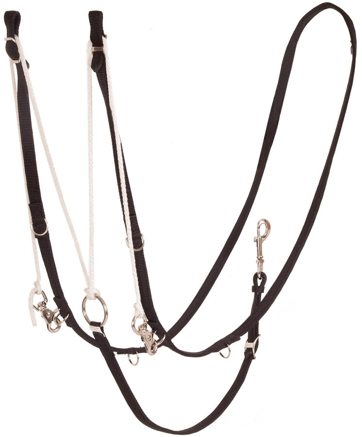 Teaches flexion and proper head set. Martingale is made from 5/8" black nylon webbing, white nylon rope and nickel plated hardware.