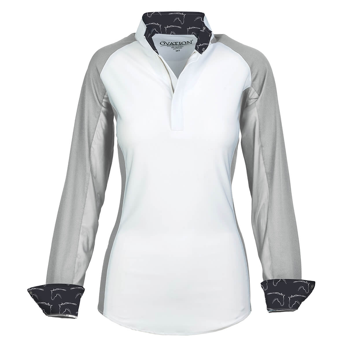 Modern show shirt! Incorporates a hidden front zipper placket with a traditional snap show collar for a polished look. Perforated mesh shoulders, sleeve side panels for all day comfort combined with sheer mesh underarm panels to keep you cool in warmer weather. Inner printed collar and cuffs and pearl button snap cuff closure for an added touch of style.