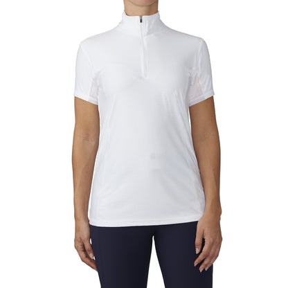 This shirt is made with perforated micro-polyester blend, perforated mesh shoulders, sleeve side panels for all day comfort combined and sheer mesh underarm panels to keep you cool. Feminine shape and longer elliptical hem in the back for extra coverage. This shirt will be your go to for schooling or clinics on extra hot days.