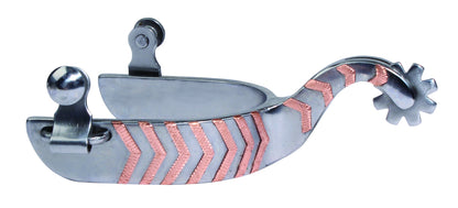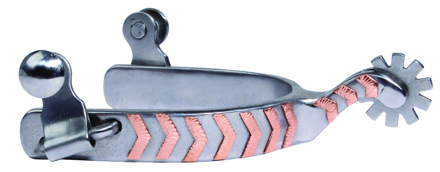 1" band spur with a 2 1/2" gooseneck shank, loose swingers and buttons, and an 8 point rowel. Copper arrows decorate the band.