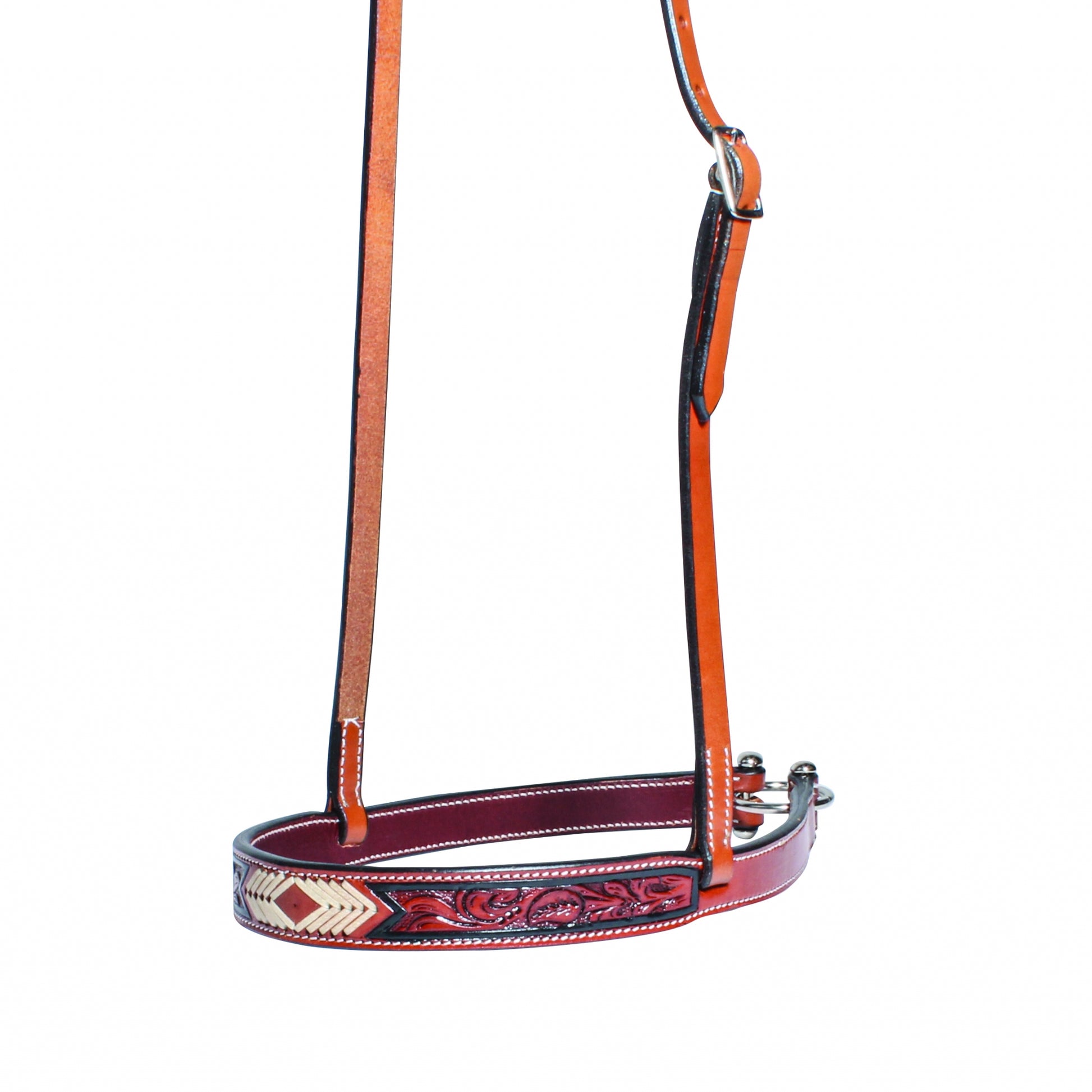 Noseband has eye-catching rawhide arrowhead accents, floral tooling with a black border. Tiedown ring. Eye-catching rawhide arrowhead accents will make this cowboy collection a standout on any horse. Make it a complete set with roper-style breast collar, noseband and choice of 1-ear or browband headstall.
