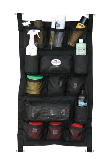 The Professionals Choice Trailer Door Caddy is the only organizer designed to accommodate both you and your horse. Durable, with both open and zipper mesh pockets to keep things organized, it includes insulated cup holders to keep your beverages cold while grooming. It easily installs securely to trailer door or stall wall with convenient mounting fasteners and adjustable hook and loop closures. Screws included. Measures 24" wide x 27" tall.