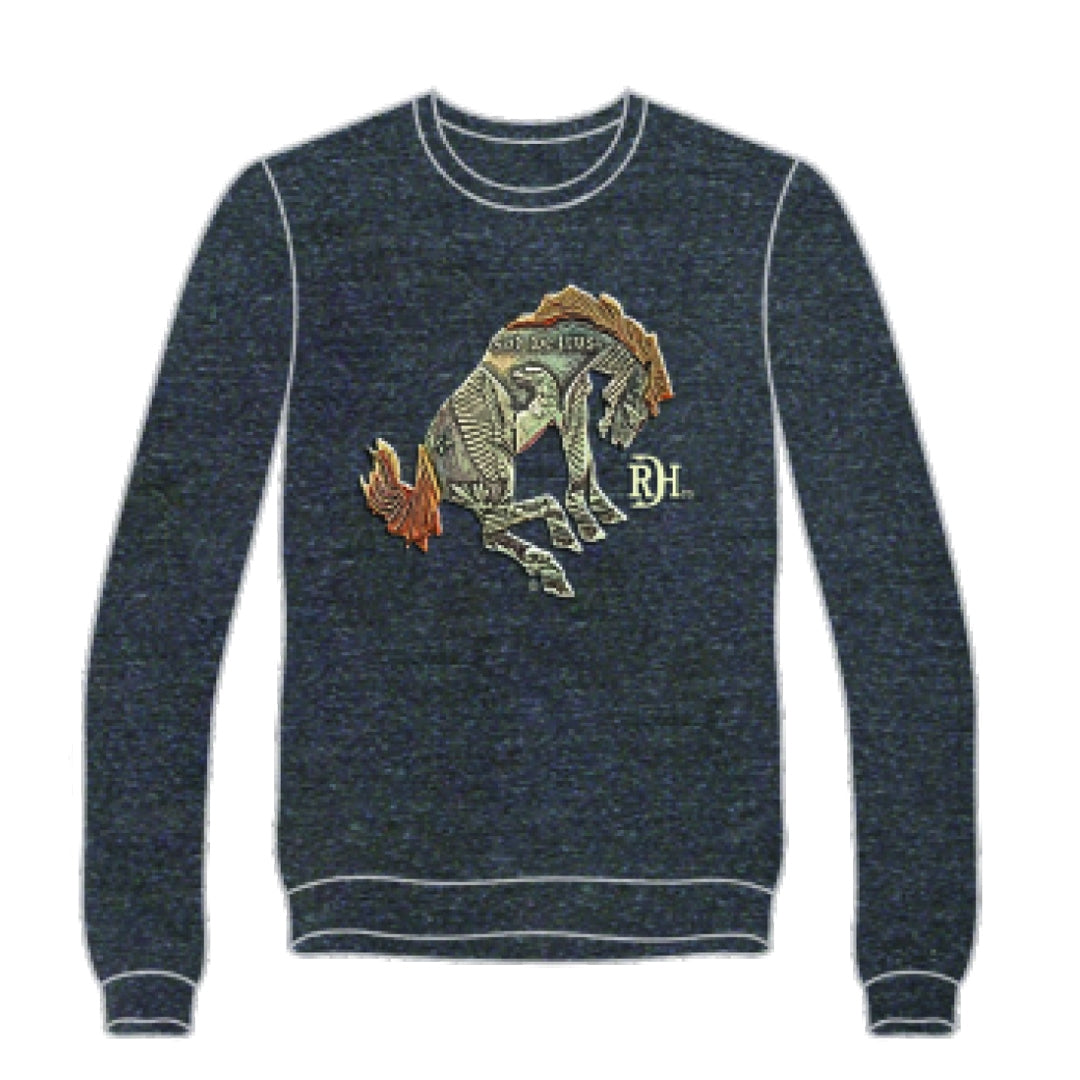 Unisex fit crew neck sweatshirt featuring the new Bucking Bronc design, as well as the signature RDH brand centered on the back.