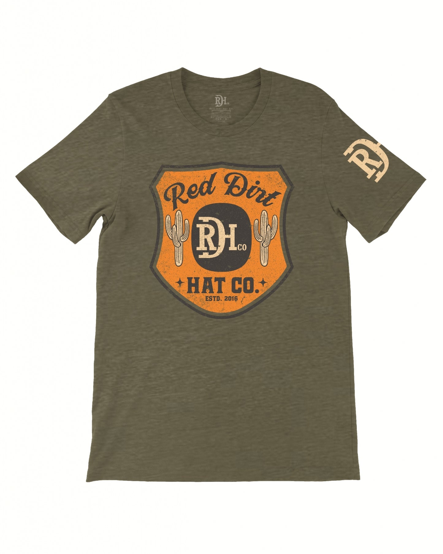Unisex heather olive t-shirt featuring the exclusive Buffalo Badge design, as well as the signature RDH brand centered on the left sleeve.