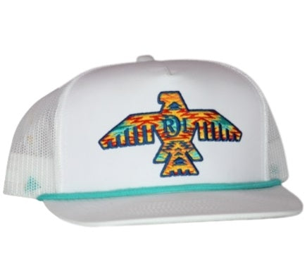 Black Mesh Back with Turquoise Rope, adjustable snapback, flat bill with turquoise rope and Aztec Logo Thunderbird on Front