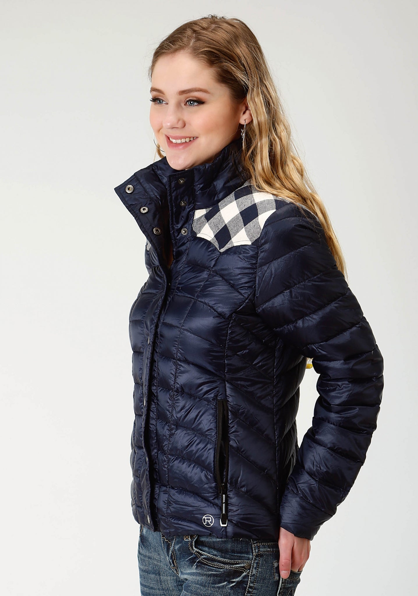 The Roper Ladies Navy Blue Rangegear Lightweight Down Jacket will be your go to cold weather layer. Short body design in parachute nylon is down filled for warmth. Design features include flannel buffalo check front and back yokes, slightly curved quilted lines with front and back princess seams for an incredible fit, inside powder cuff, stand up collar and a snap front. Zippered front pockets keep your things secure. Reflective screen print logo on 100% nylon.