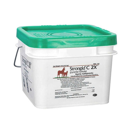 Mixing and Feeding Directions: STRONGID C 2X is to be administered on a continuous basis either as a top-dress or mixed in the horses daily grain ration at the rate of 1.2 mg pyrantel tartrate per lb. of body weight daily. To achieve this dose, administer 0.5 oz. per 250 lb. of body weight (2 oz. per day for a 1,000 lb. horse). STRONGID C 2X should be administered for the entire period that the animal is at risk to internal parasites. Unprotected animals that have grazed may already have an established S. vulgaris larval infestation. Before administering, these animals should be treated with a therapeutic dose of a larvicidal product. Foals may be administered STRONGID C 2X as soon as consistent intake of grain mix is occurring, generally between 23 months of age. STRONGID C 2X may be used in mares at any stage of pregnancy or lactation. Stallion fertility is not affected by the use of STRONGID C 2X.