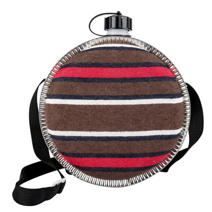 Rugged molded PVC canteen with saddle blanket cover and screw cap with chain, wide shoulder strap and metal corner guards.