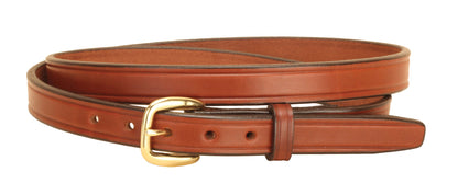 From the original Tory Leather - MADE IN USA. This 3/4" wide belt is an English bridle leather creased belt with a solid brass buckle. The belt fits many needs as is or it is widely used with multiple name plates. The buckle is attached with snaps. The belt size is 2" larger than the waist size. To choose the correct belt size, take your waist size and add 2". For example, a 36" waist will need a 38" belt.