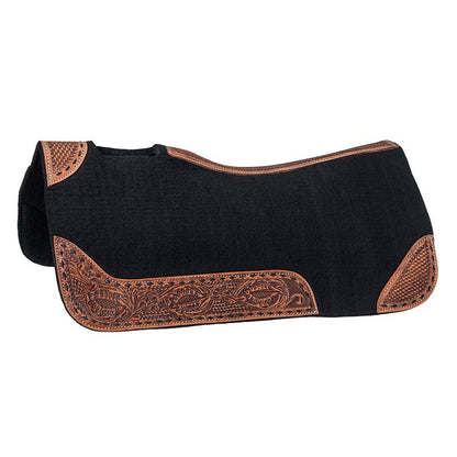 30 x 30 contoured felt saddle pad. Features hand tooled floral and basketweave leather accents with buckstitching details.