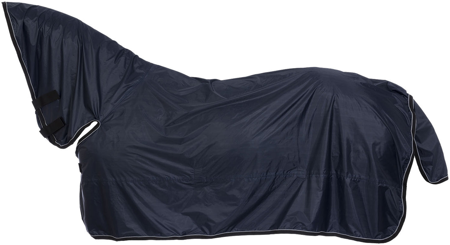 This is a great sheet for keeping your horse dry whether at the hitching post while camping or at the trailer during a show. The lightweight, breathable material is ideal for summer or fall. It can even be put on while your horse is saddled to keep the saddle dry while waiting for your class or to head out on the trails. It's made of 320D poly material with adjustable quick grip front closure, and the attached neck cover has two adjustable quick grip closures and a quick grip halter loop to help keep the neck cover in place.