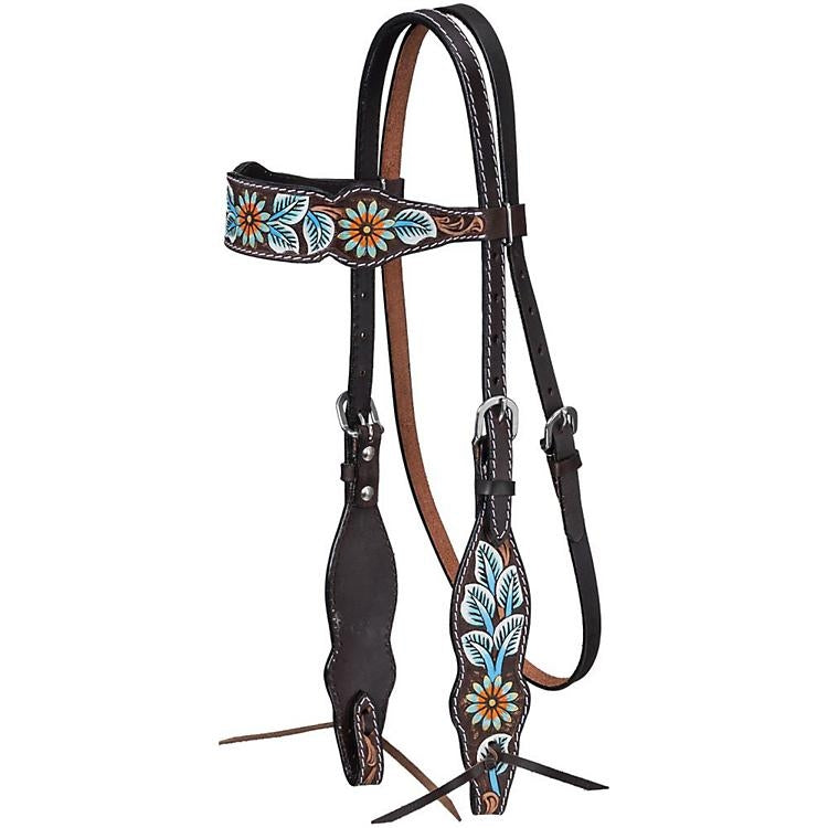 This rich, dark oil browband headstall is constructed from supple, premium leather with stainless steel hardware. Cheeks and brow feature beautiful vintage inspired floral and leaf hand-painted designs in shades of turquoise and orange that offer a bold contrast to the dark leather base. Complete with a single-stitched white edge and tie bit ends.