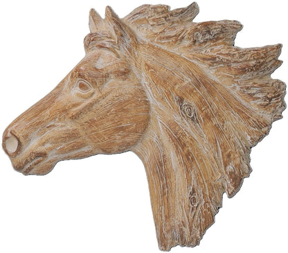 Beautiful horse head wall art piece with natural weathered wood look. Made of resin. Hook on back for easy hanging.