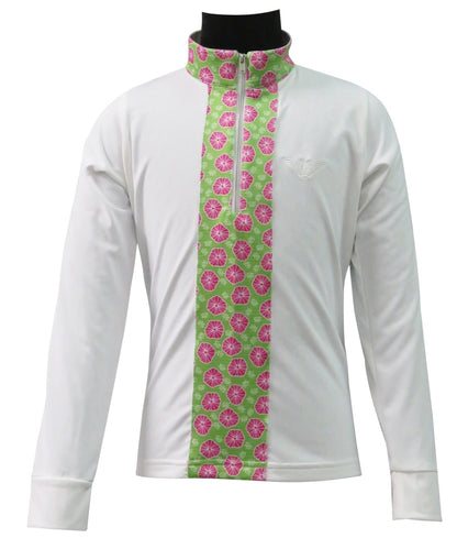 TheTuffRider Kids Athena EquiCool Sport Shirtis available in a tropical floral pattern in three color options. The EquiCool technical fabric wicks away moisture and provides UV protection, these functions, along with the ventilated sleeves, will keep your young rider cool and dry on the warmest days. This shirt is also designed with a front zipper that can be zipped down for a polo look. Check out our matching riding tights, socks, and saddle pads to complete the outfit.
