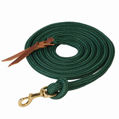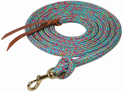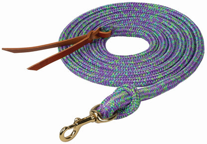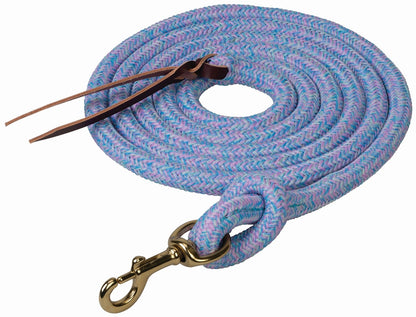 Poly cowboy lead in an array of beautiful colors is made from UV-resistant polyester for the ultimate in durability and long life. Constructed with a swivel snap on one end and a leather popper with bleeding heart knot on the other end. Measure 5/8" x 10'.